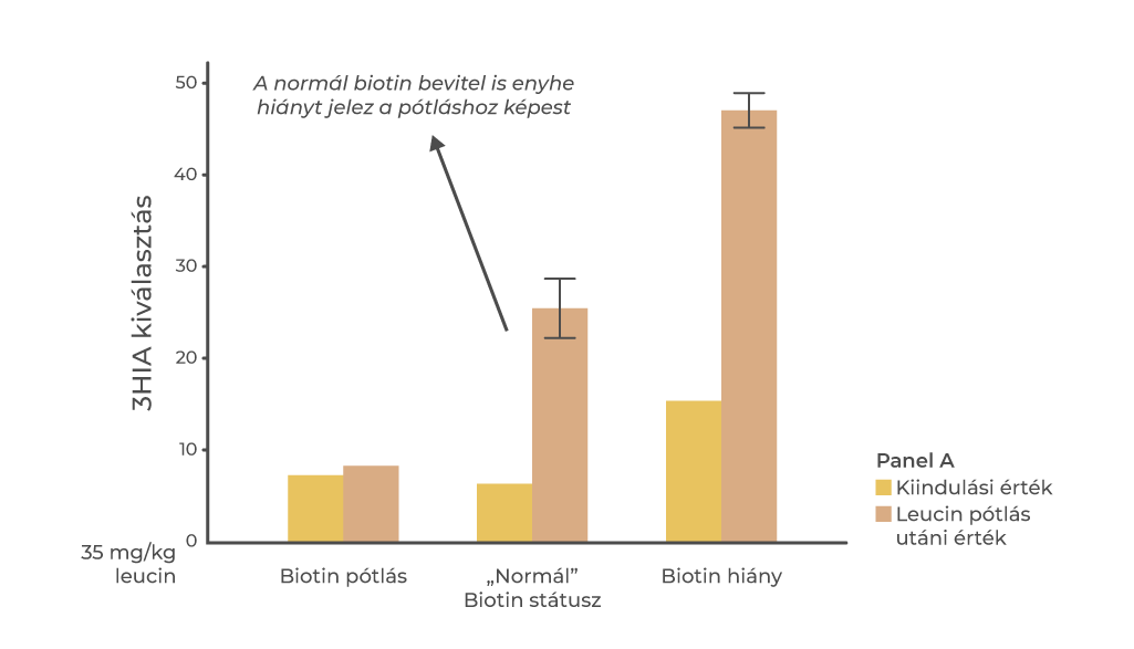 Az ábrán jól látható, hogy hagyományos étrend esetén még mindig jelentős volt a 3-HIA kiválasztása a leucinpótlást követően, míg akik 300 mcg biotint is szedtek az étrendjük mellé, azoknál szinte alig emelkedett. Miután magasabb leucin dózissal megismételték a kísérletet ugyanezt tapasztalták.